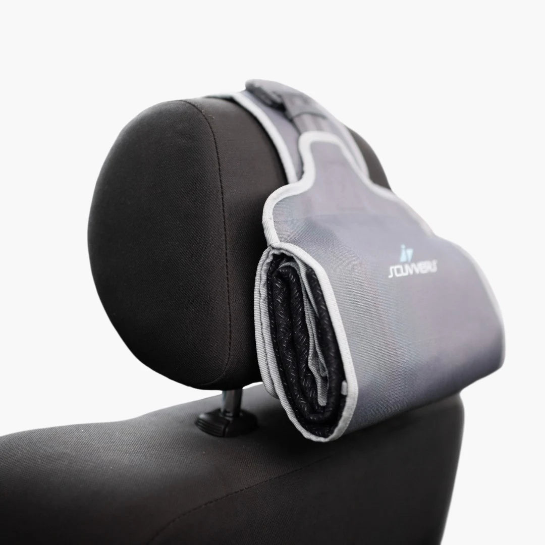 The Harness wraps around your headrest and stays in place to secure the Cover section to the seat while it is deployed or stowed. With the detachable pouch, you can stow your Cover behind your seat headrest, in the door pocket, in the glove compartment, or just throw it in your kit bag for when you need it next.